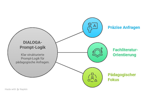 DIALOGA arbeitet mit einer klar vorstrukturierten Prompt-Logik. Lehrkräfte geben Thema und Zielsetzung ihrer Anfrage präzise an, etwa:
