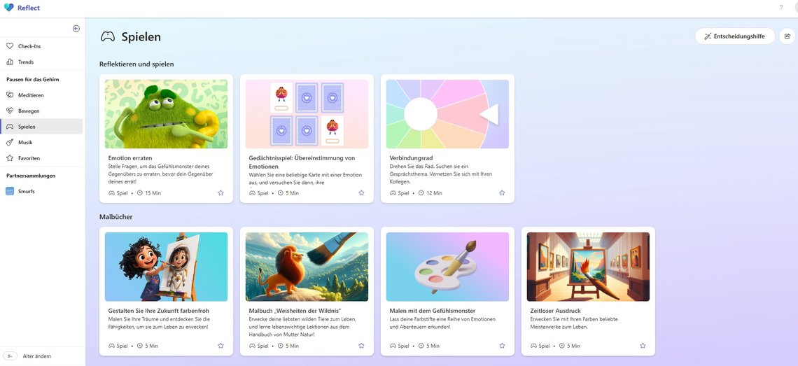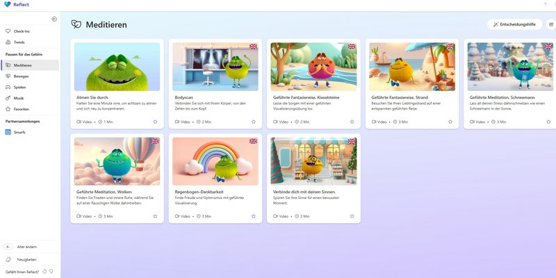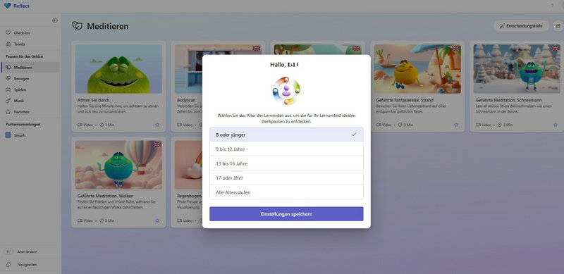 Ergänzend bietet Reflect „Pausen fürs Gehirn“: kurze, angeleitete Videos zu Atemübungen, Body-Scans, Bewegung oder Entspannung, die Konzentration und Wohlbefinden im Schulalltag unterstützen.