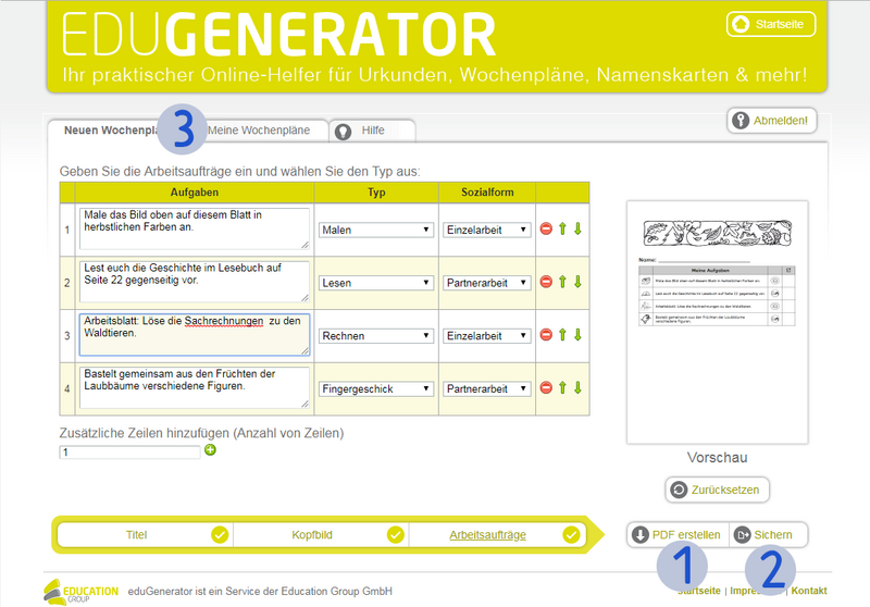 Der Wochenplangenerator ist ein Tool des EduGenerators - einer Sammlung von praktischen Online-Helfern. Die Grundfunktionen des Wochenplangenerators sind kostenlos und ohne Registrierung verwendbar.